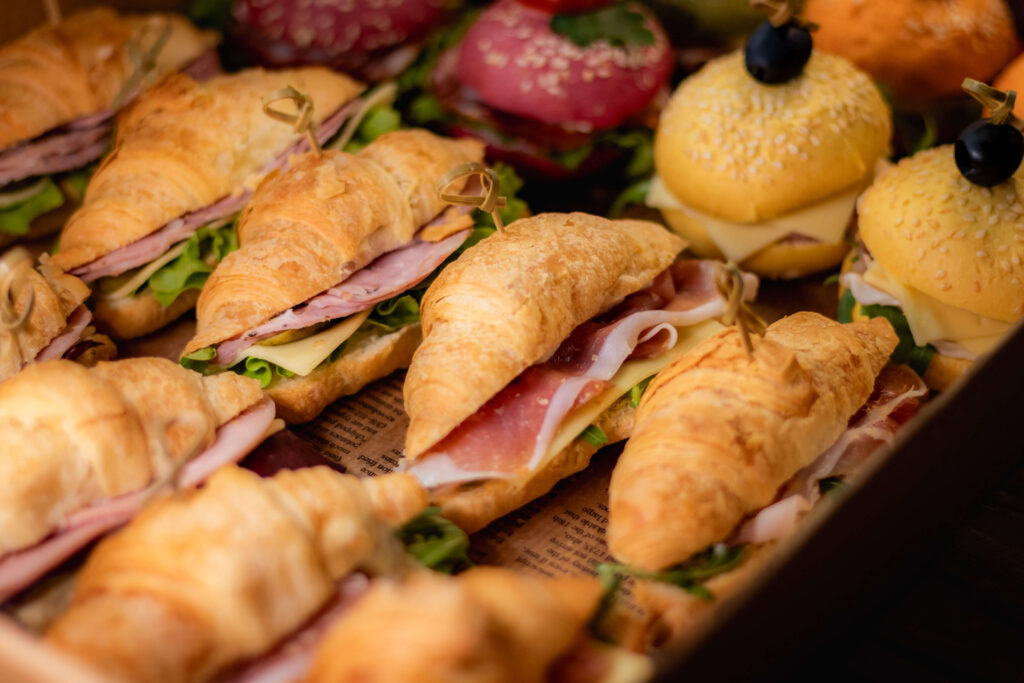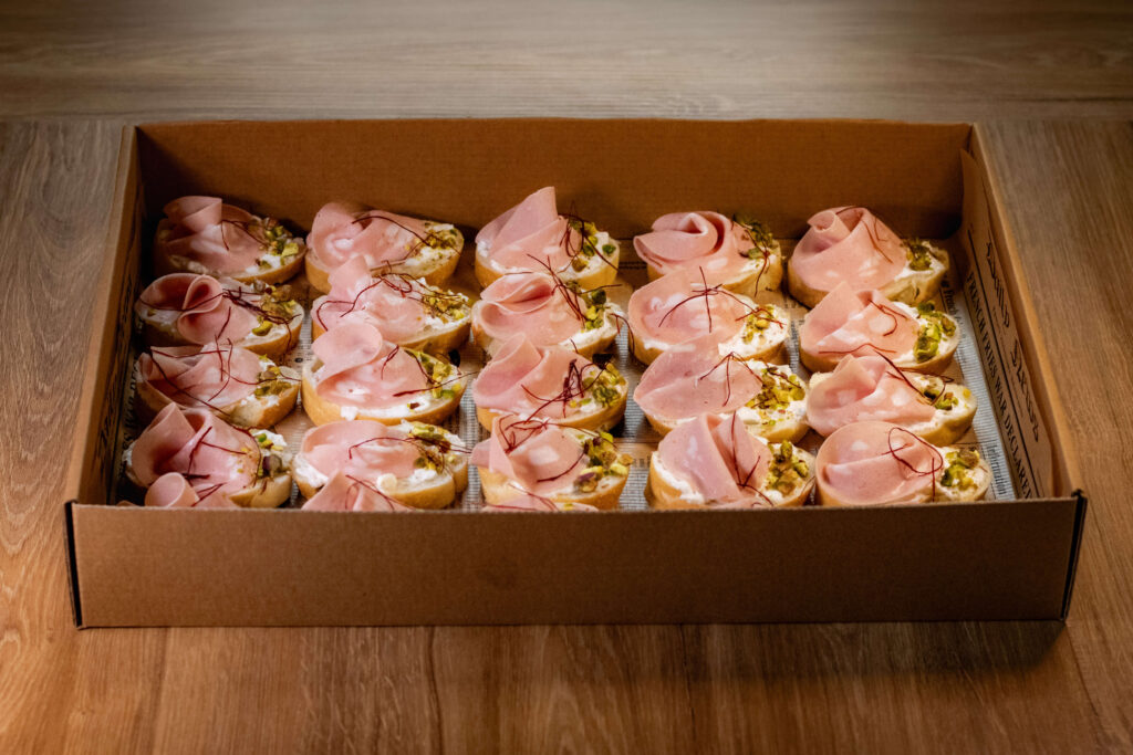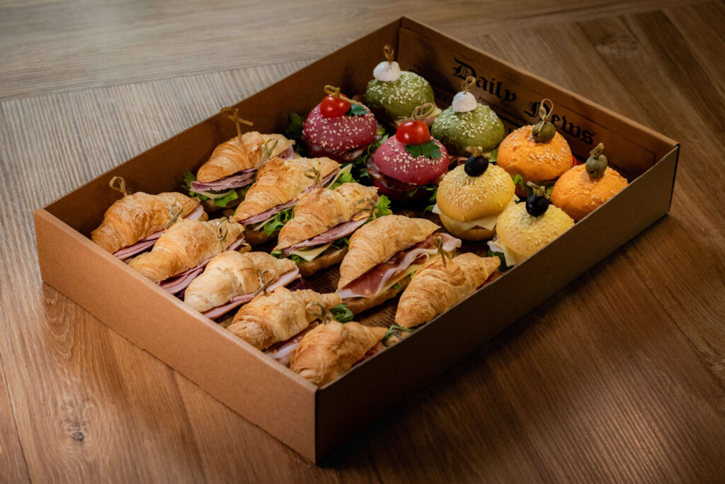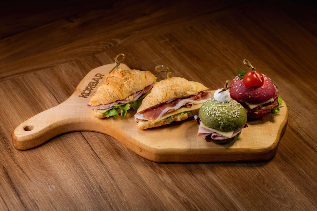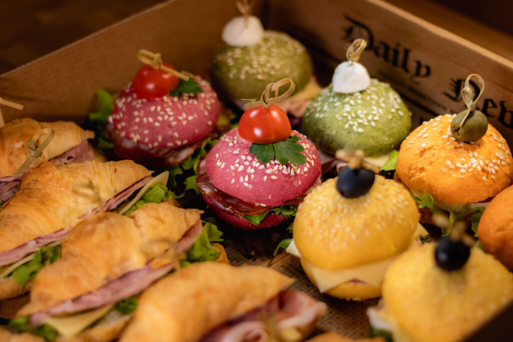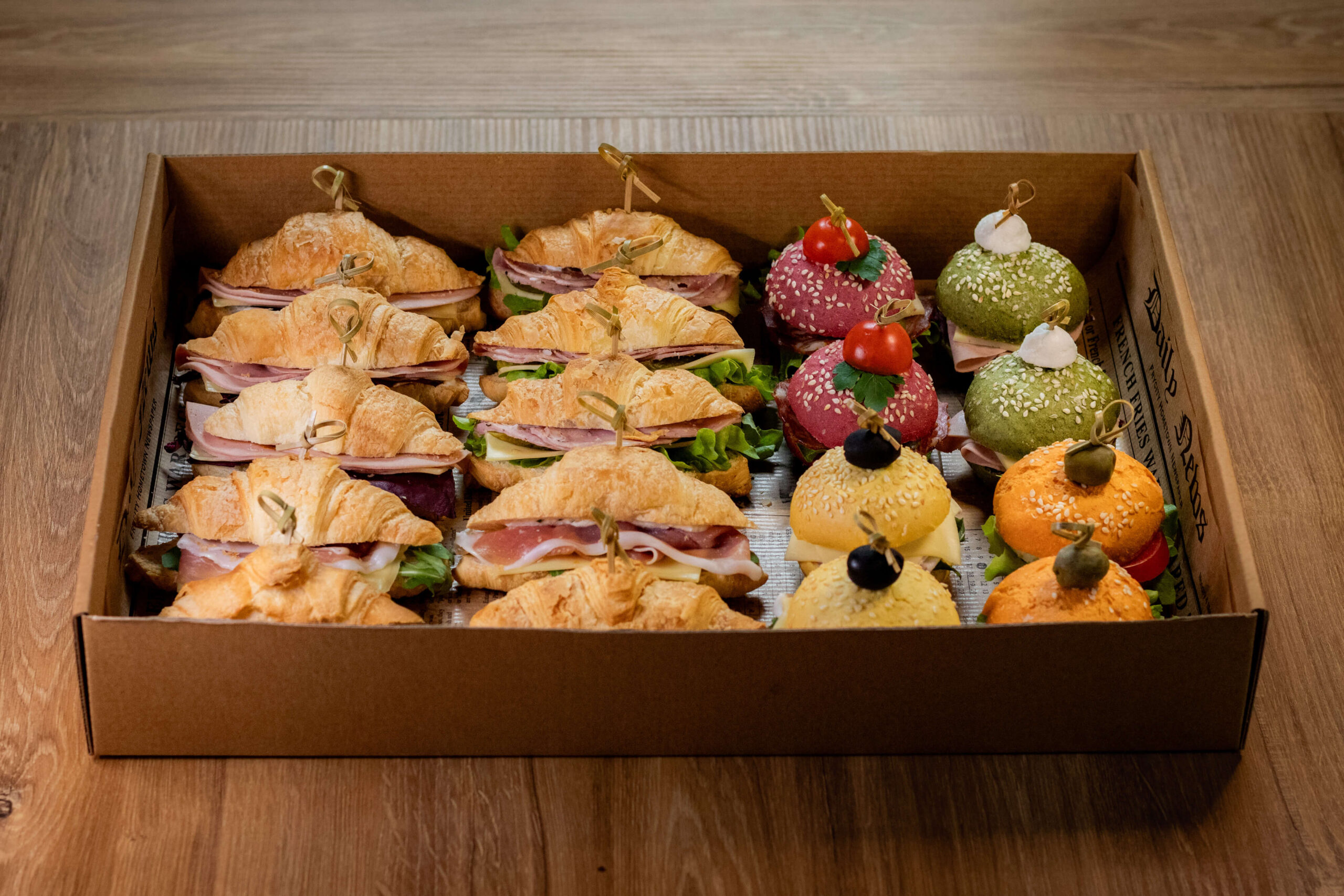 mini francoski rogljiček, rukola, sirni namaz s skuto, pršut, sir cheddar; rdeča mini bombeta, sirni namaz s skuto, piščančja prsa, sveža kumara, sir gauda; rumena mini bombeta, sirni namaz s skuto, pršut, rukola, sir cheddar; oranžna mini bombeta, bazilični pesto namaz, mozzarella, paradižnik, solatni list; zelena mini bombeta, burrata sir, mortadela, rdeči radič, sir gauda