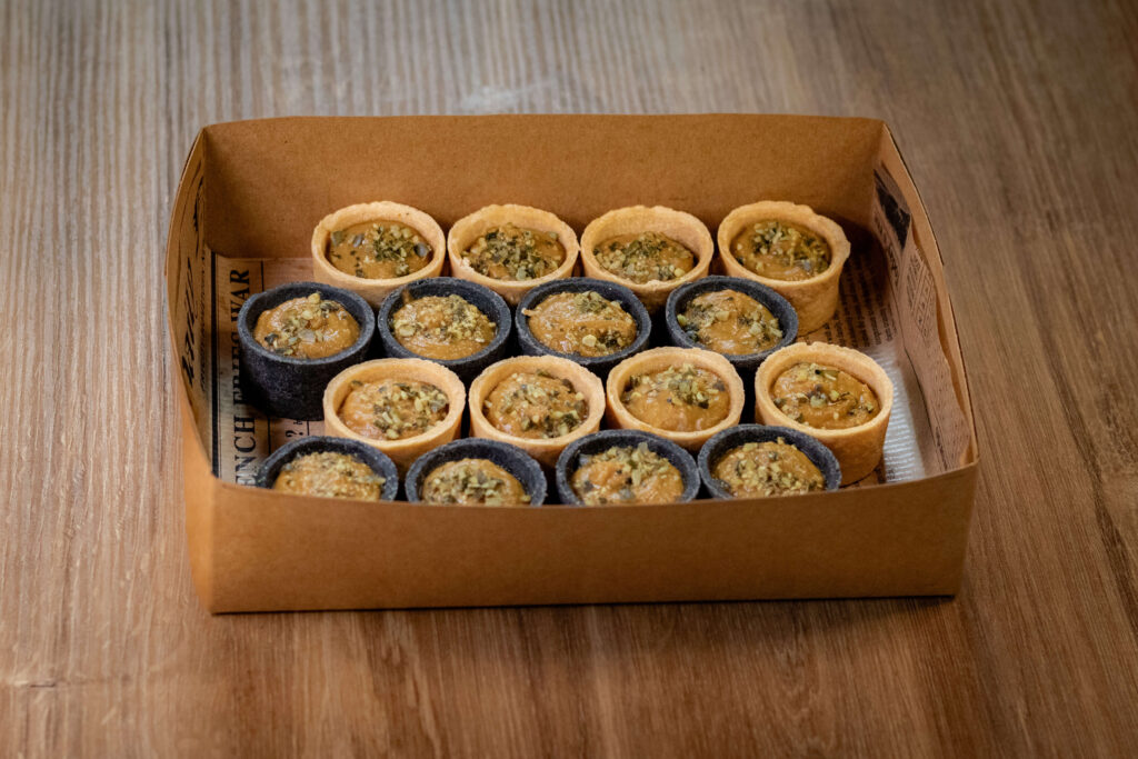 Mini bombetke v štirih barvah: rdeča s piščancem, kumaro in gaudo; rumena s pršutom, rukolo in cheddarjem; oranžna z baziličnim pestom, mozzarello in paradižnikom; zelena z mortadelo, burrato in rdečim radičem.