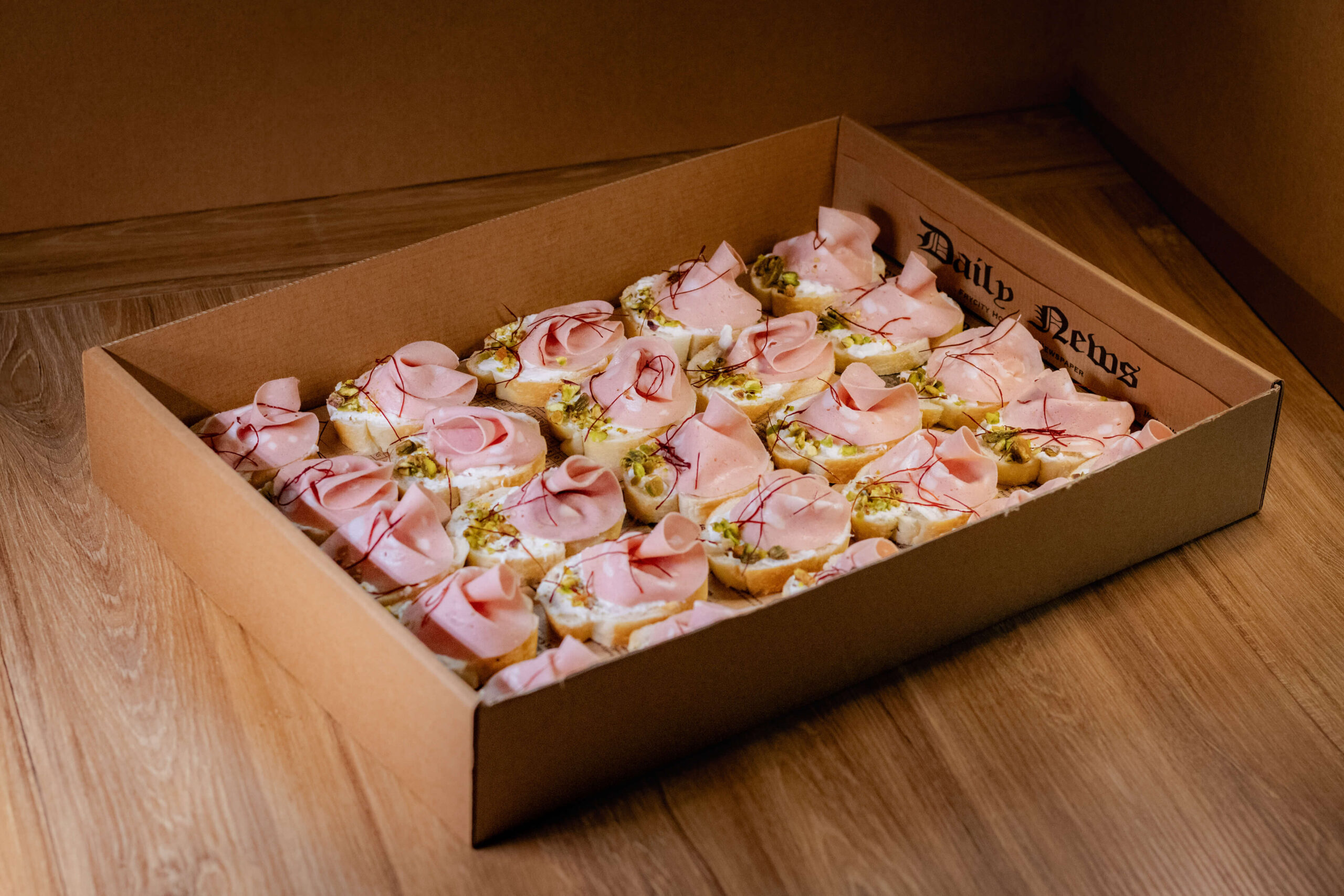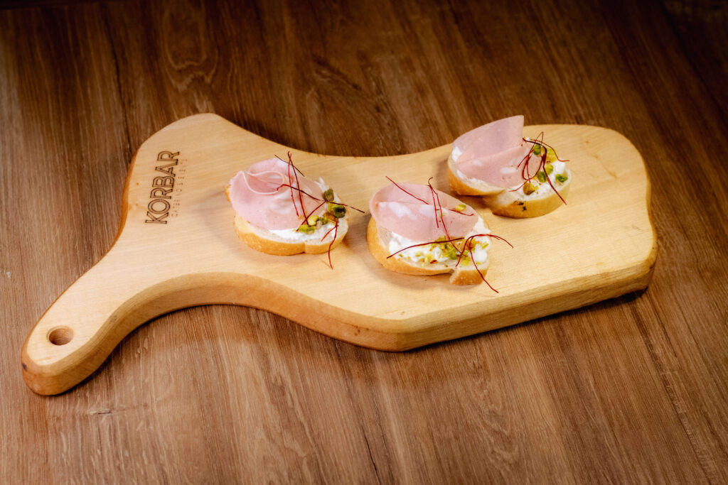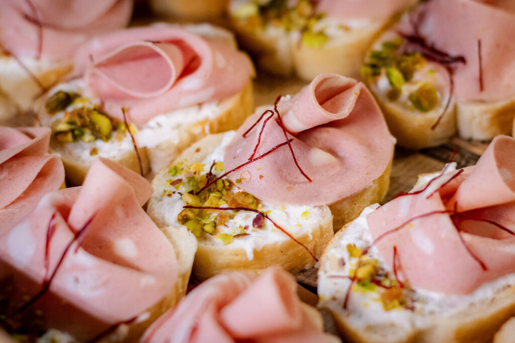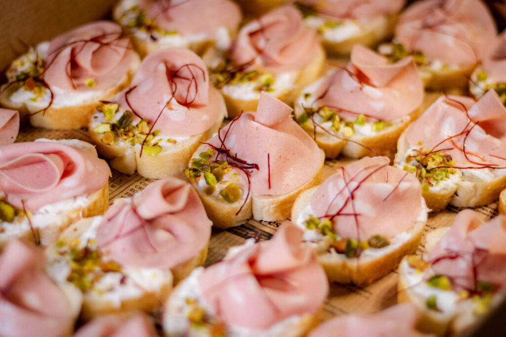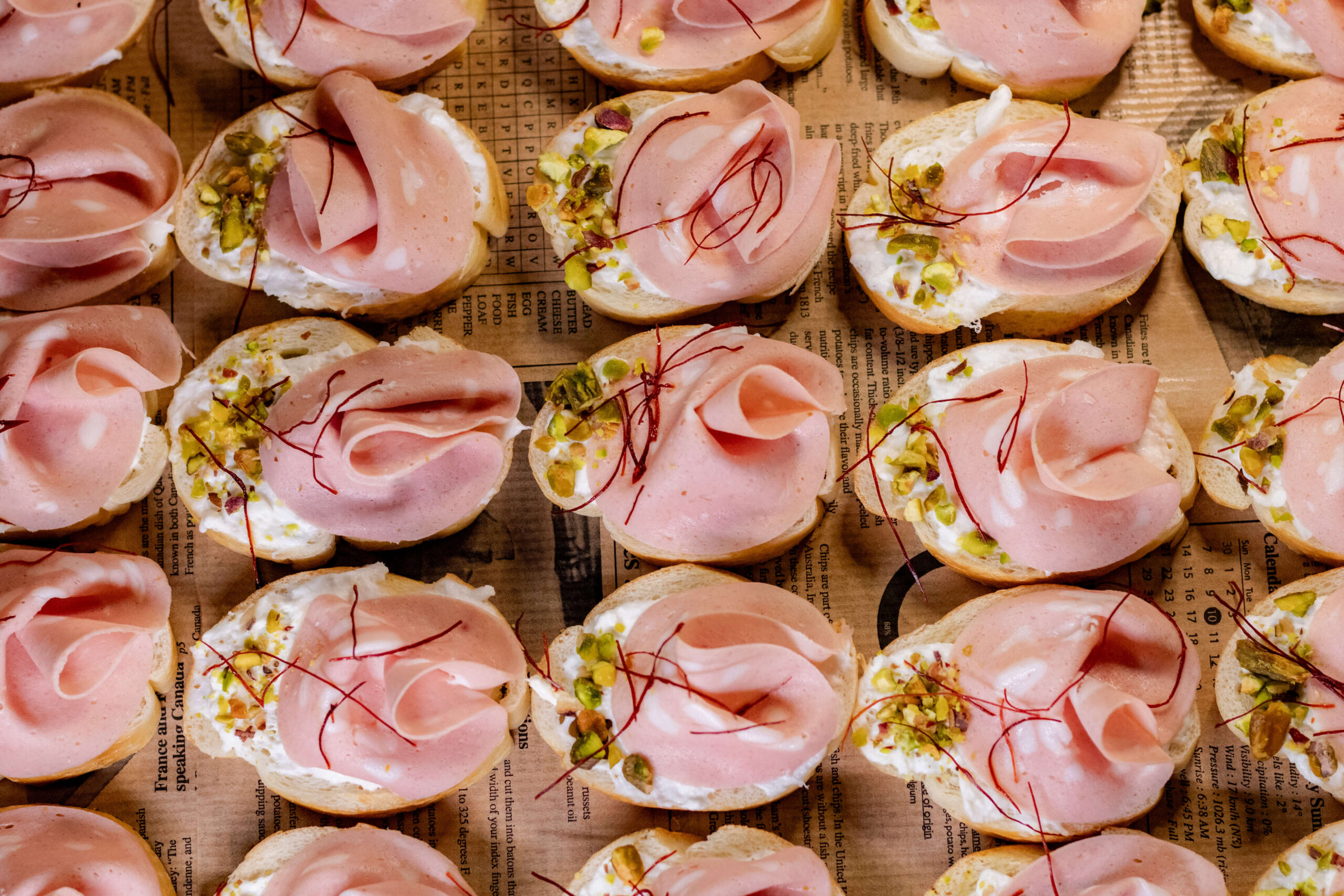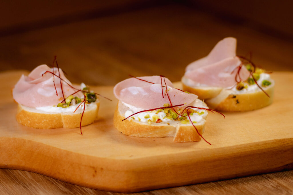 Kanapeji, ki združujejo kremasto burrato, aromatično mortadelo in pražene pistacije na sveže pečeni bageti.