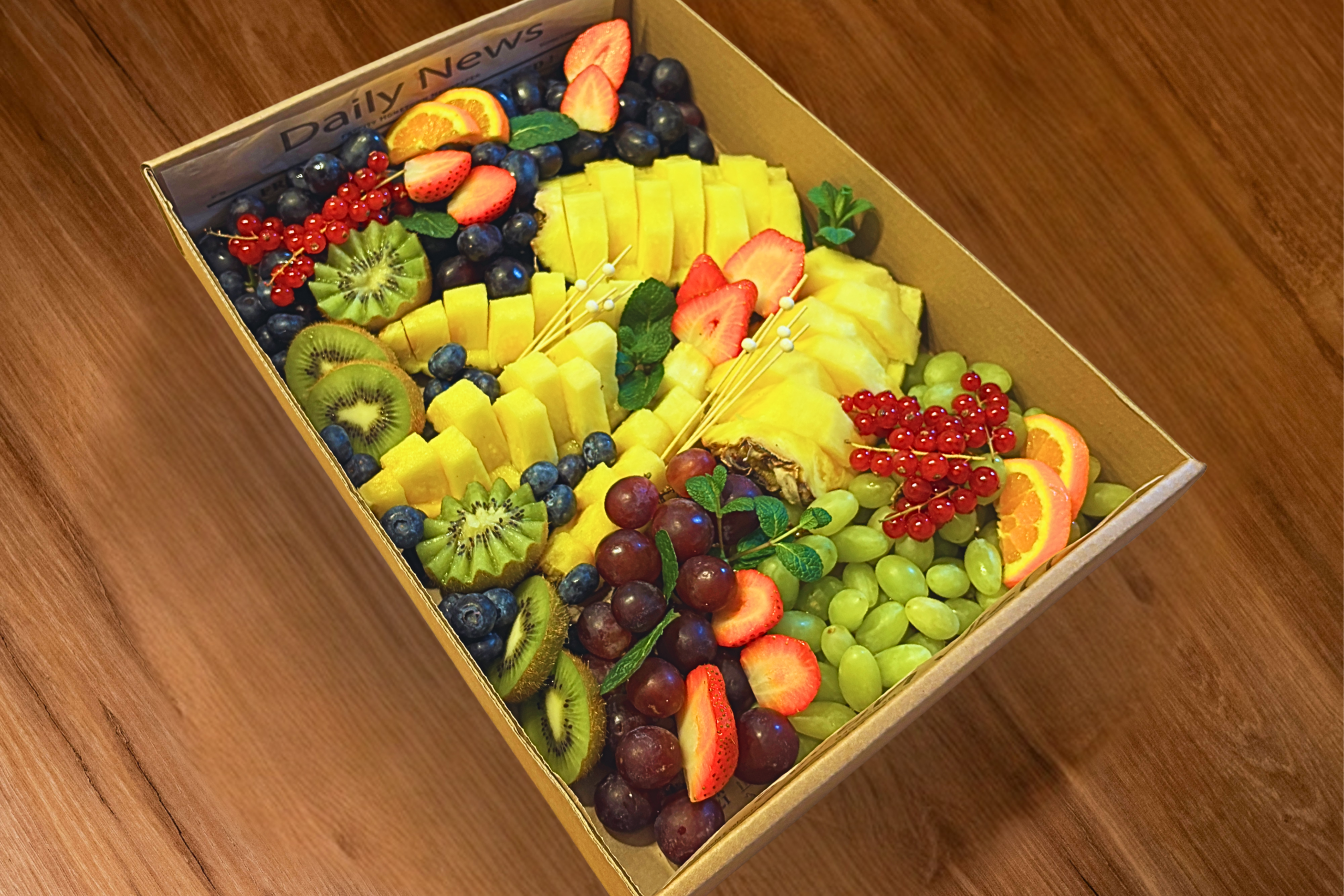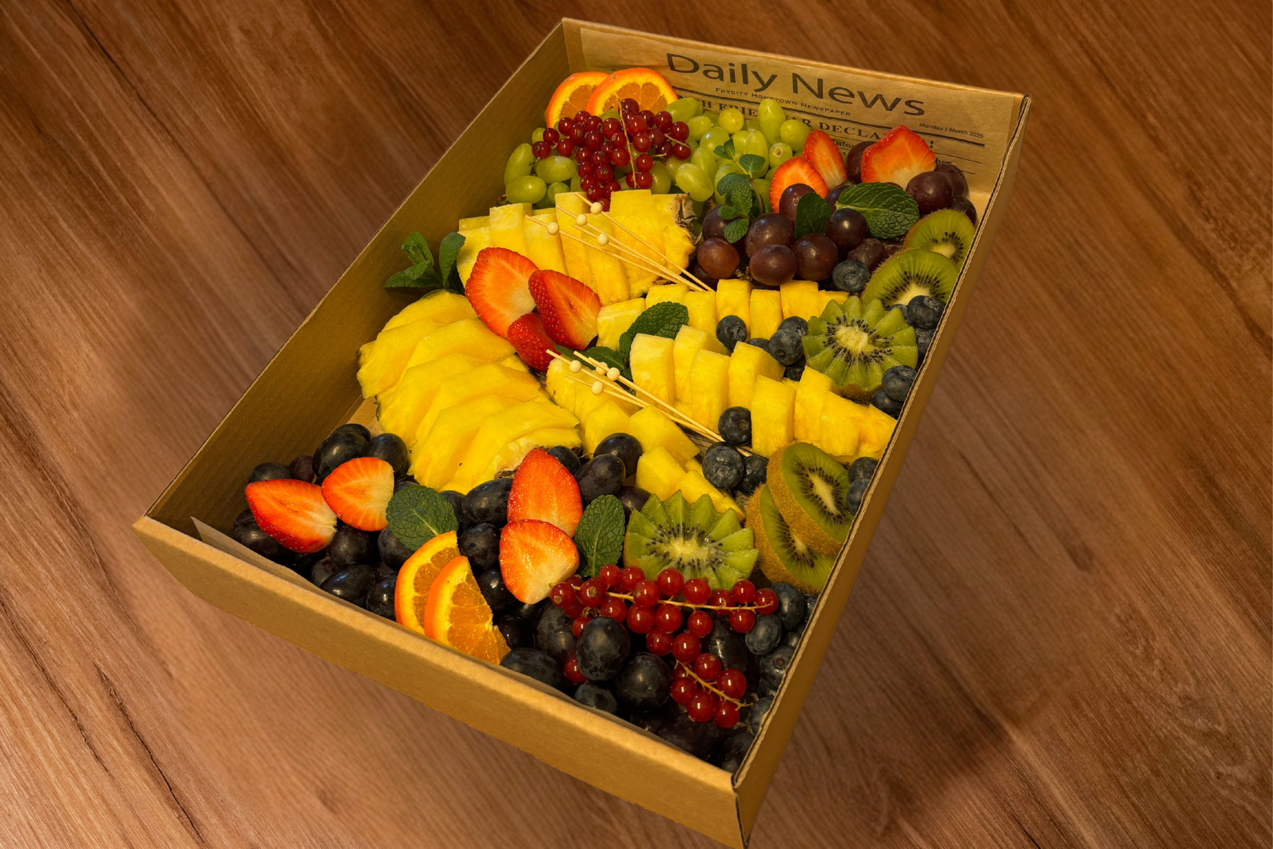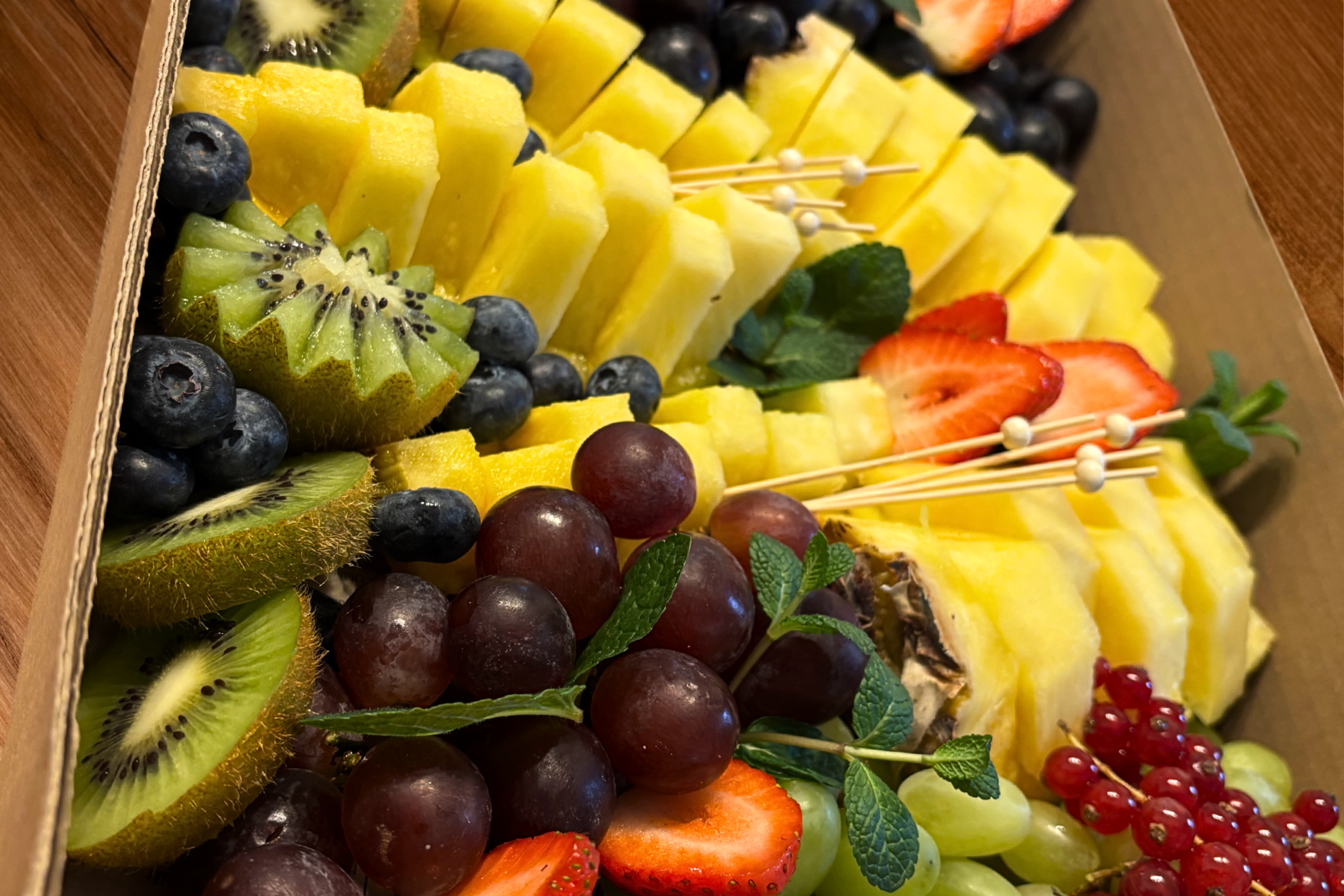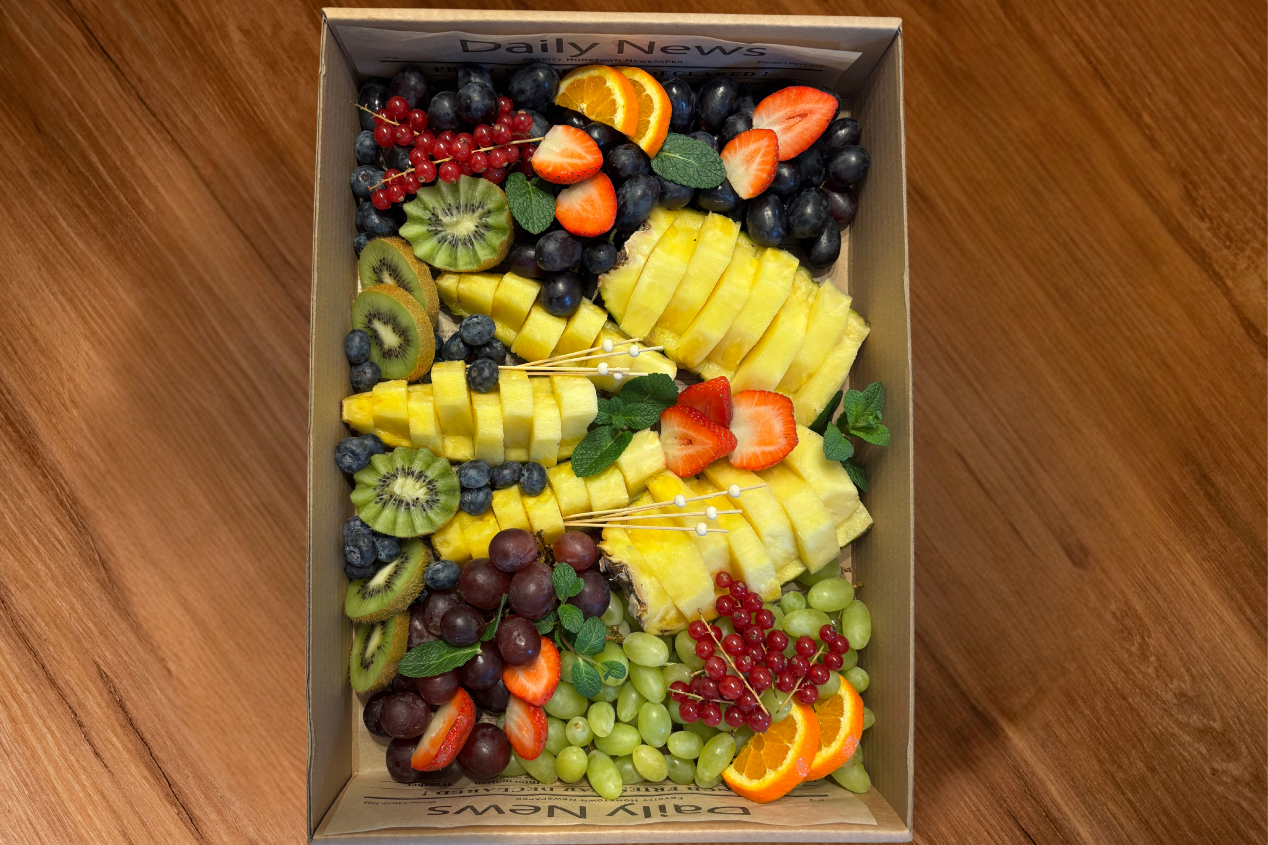 Osvežilna plošča s skrbno izbranim sezonskim sadjem – belim in rdečim grozdjem, ananasom, melono, jagodami, borovnicami, rdečim ribezom in pomarančo. Barvita, sočna in polna naravne svežine.