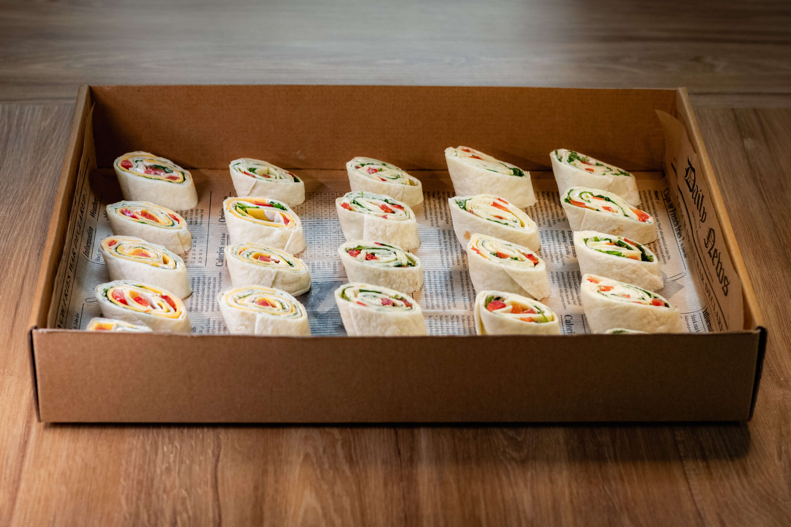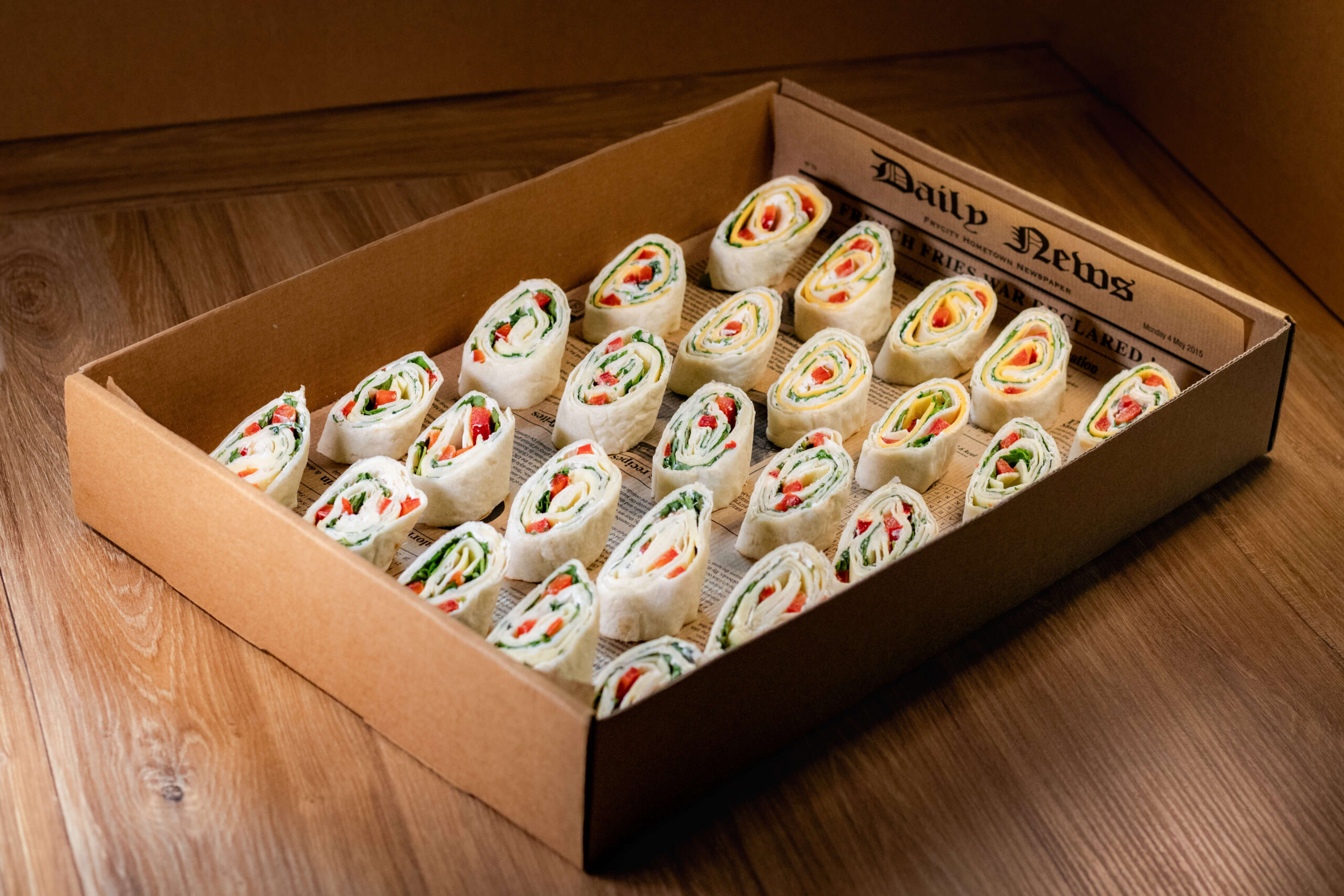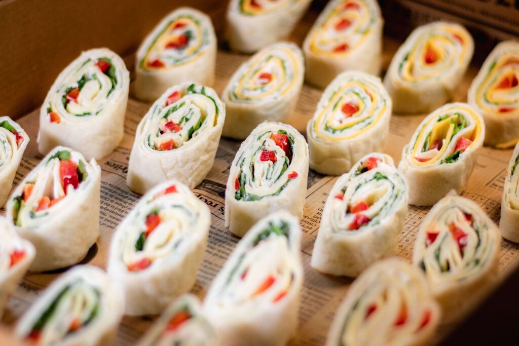 Barviti vegi zvitki iz mehke pšenične tortilije, premazane s kremnim sirnim namazom in obložene s svežo špinačo, rdečo ter rumeno papriko.